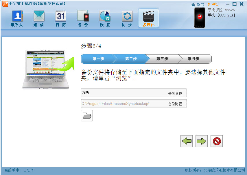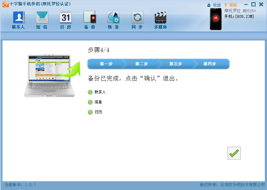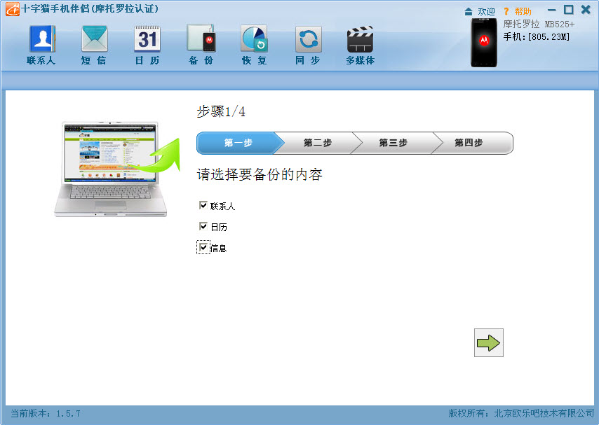 4、打开十字猫手机伴侣,自动识别手机摩托罗拉 MB525+,第一步选择需要备份的内容,联系人、日历、信息: