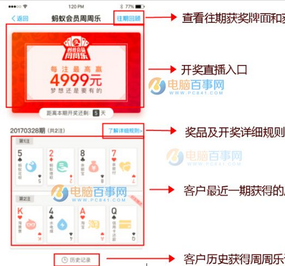 每周三晚上8点会进行周周乐开奖,开奖环节在周周乐产品页面进行视频直播开奖。开奖后,用户来到周周乐页面可以查看当期或者往期的周周乐开奖记录)