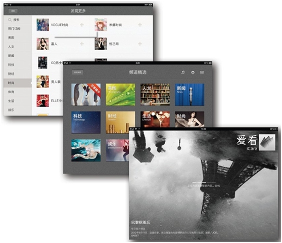 腾讯爱看iPad1.6新版预计将于九月底上线。全新的界面设计,真实杂志般精美排版,扩展上百家媒体,并新增对腾讯视频内容的支持,带来全新的丰富阅读感受!同时新增内容源的订阅功能,并基于不同阅读需求预设多个频道,精选了相关领域的优秀媒体(持续更新),消除了普通用户对查找优秀内容源的烦恼。