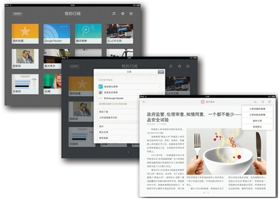 3. 社会化阅读:支持在爱看上以新的杂志化版式阅读个人微博,分享、评论和收藏,可以绑定Google Reader帐号,以聚合或者分内容源方式阅读。用户还可以把喜欢的内容源加入到自己的订阅列表,方便阅读。一个应用可以解决多个问题!