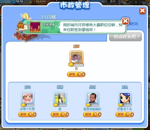 除靓丽外表为城市添加了靓丽风景外,作为市政建筑中一员,月宫楼还以它强大的职位提供能力吸引玩家的心。玉帝、王母、嫦娥、吴刚、玉兔五大职位,和神话时代紧密相连,让你体验成为神话人物的感觉,增加游戏互动,促进好友交流。