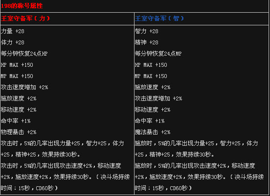 称号又分为物理和魔法两类,故本介绍内容中,以括号前为物理系称号特有属性,括号中的为魔法系称号特有属性,未加括号标注的为共有属性。