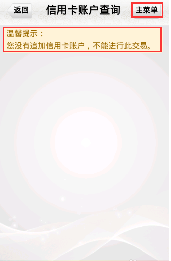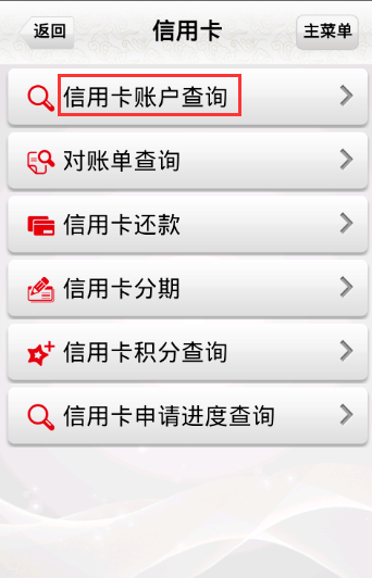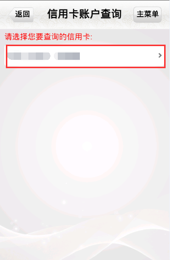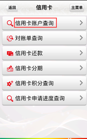 点击右上方的主菜单,返回手机主菜单,然后再点击信用卡,进入信用卡界面后再点击信用卡账号查询,此时系统就可以显示自己的信用卡账号了。点击信用卡账号即可查询信用卡账单了。