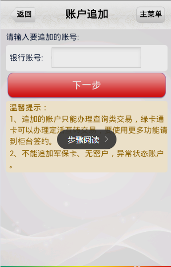 点击账户追加,进入到账号追加界面,在输入框内输入自己要追加的银行卡卡号。