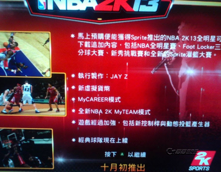 NBA2K13目前还没有正式发售,据NBA官方推特称,预计于当地10月2号发售,2K13将登录Xbox360,PS3,Wii,PSP以及PC平台。
