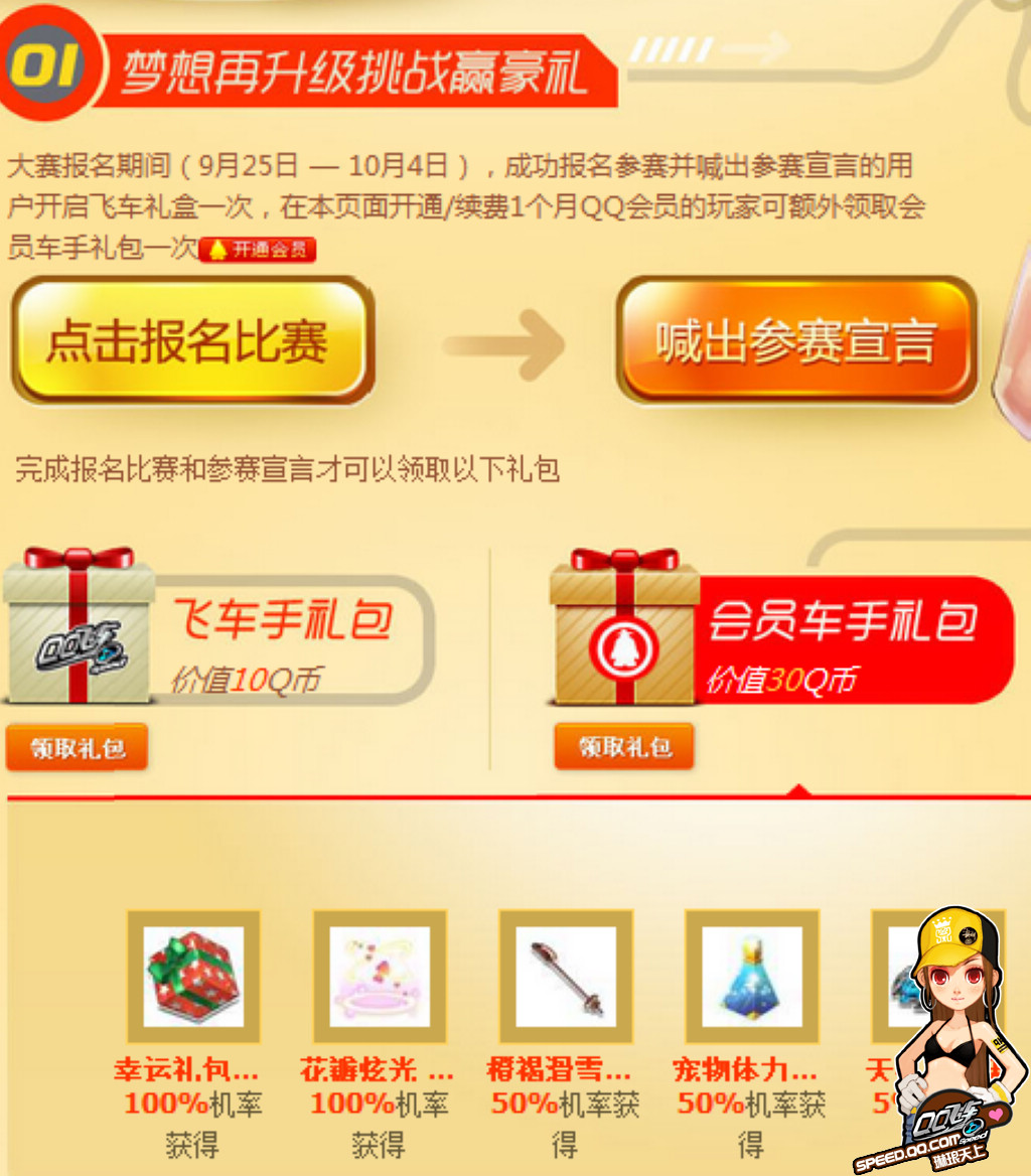 (一),在9月25日至10月4日成功报名的玩家,并喊出参赛宣言,即可获得一次开启飞车礼盒的机会。飞车礼盒的奖励包括“点火装置”“表白小喇叭”等实用道具,更有机会获得“7天天机线”极品赛车;