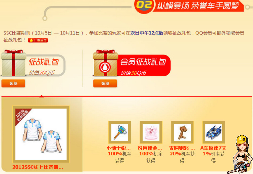 此活动的比赛时间是10月5日至10月11日,奖励礼包包括价值20Q币的“征战礼包”和价值30Q币的“会员征战礼包”,参加比赛的玩家可以在次日12点后领取征战礼包,QQ会员玩家还将额外获得“会员征战礼包”。“征战礼包”包括“2012SSC线上比赛服饰”、“7天A车锐速”等极品道具。“会员征战礼包”包括极品宠物“红毛使者”、“彩色礼盒轮胎印”等。