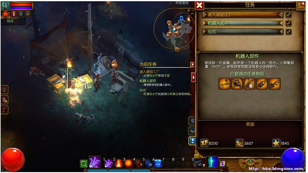 7.搜集完5个零件后回城找博士组装,组装完后左边便会出现新NPC,可以接到新任务奖励非常不错让我在80时几乎跳了两等,而且还有三件本职业的金装,以及一个必掉一件金装的小副本。