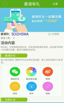 即日起分享邀请码给好友,好友使用邀请码登录,彼此都可获得100M本地流量(需开通GPRS功能),最多可邀请8位好友。
