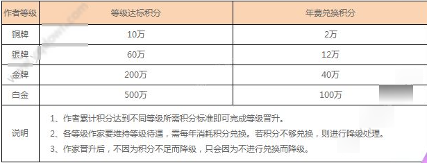 (1)、对于老作者的等级保持不变,默认作者已到达等级积分标准,默认作者当年度已经兑换过年费(2016年12月—2017年11月30日),自2017年12月起,作者需按新标准用积分兑换等级资格。