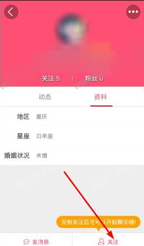 3、在他人个人主页界面,点击右下角的的关注按钮就可以关注他人,