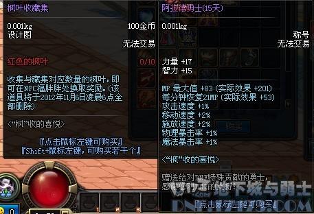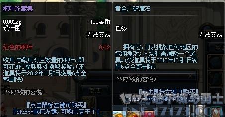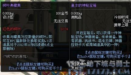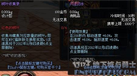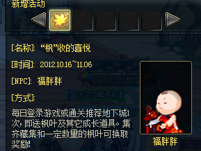 玩家在2012年10月16日开始至11月06日每天登陆游戏或者是通关推荐的地下城任务 就可以获得红色的枫叶,任务分为4种,收集红色的枫叶越多 以此获得奖励也会越好,最高可以获得皇女的神秘宝箱,来开出传承或者是神器等等