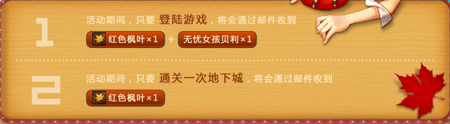 如图:在10月16日-11月6日期间登陆游戏就能获取红色枫叶+1,通关地下城一次+1,玩家可多次通关