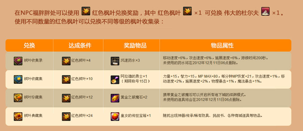6活动中的枫叶集,阿拉德枫叶等道具将在2012年11月06日06点删除,黄金之破魔石和风速药水将在2012年12月11日06点删除。