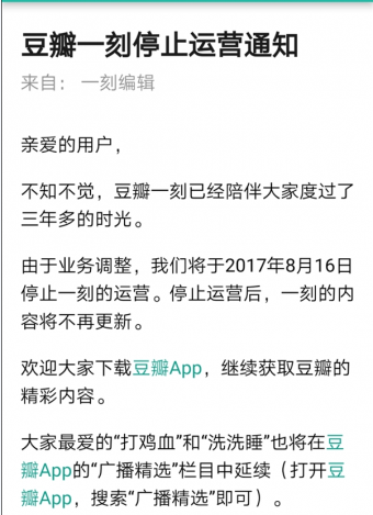一刻团队推荐下载豆瓣App,继续获取豆瓣的精彩内容。此外,“打鸡血”和“洗洗睡”也将在豆瓣App的“广播精选”栏目中延续。
