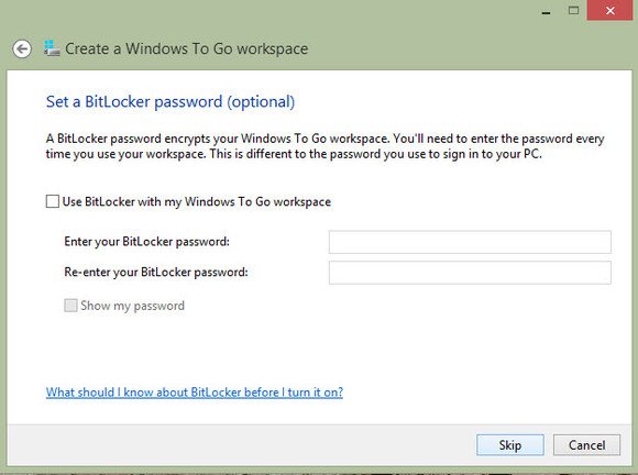 4 用BitLocker加密Windows To Go优盘。虽然这个步骤是可选的,可以跳过,但我们极力推荐它。你只需键入密码即可。