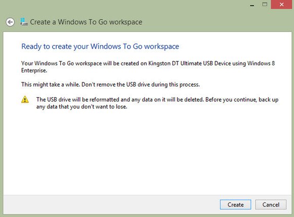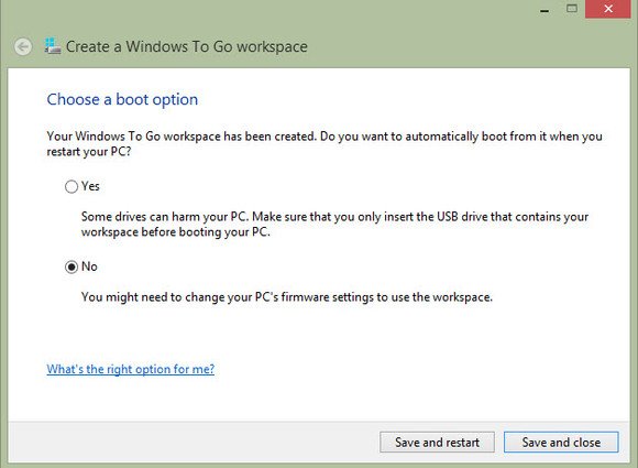 用Win 8 Enterprise创建Windows To Go优盘非常简单。首先准备好一个映像,然后打开Windows To Go向导。你需要一个高速优盘,容量至少为32GB(微软认证过一些优盘,并建议使用USB 3.0 优盘,因为它们的闪存存储器质量更高)。选好Windows To Go 优盘之后,你需要选择一个映像,然后启动这个进程。目标优盘将被重新格式化,你可以使用BitLocker保护它。安装过程需要10分钟左右,它会询问你是否要重新配置这台PC,让它将来直接从USB启动。