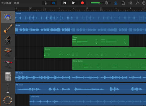 • 使用 Inter-App Audio 直接将兼容的第三方音乐应用程序录音到 GarageBand 中