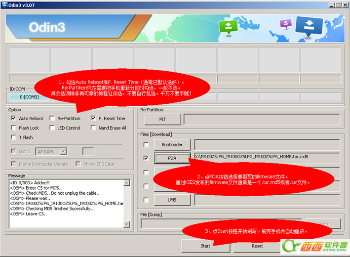 4、在Odin界面上勾选“Auto reboot”和“F. Reset Time”,确认其它的都没勾。点“PDA”按钮,选择要刷写的Firmware文件。注意:这里以及图片里说的选择哪些哪些、不选择哪些哪些,是针对官方KIES发布的Firmware举例的。实际使用时根据你要刷写的Firmware版本、来源以及刷机目的的不同,可能会有不同的选择。