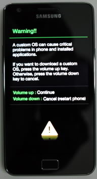 2、手机不要连到电脑上,先关机,然后按住【音量-】和【Home(主屏)】键不放,再按住【电源】键不放,直到屏幕点亮时松开三个键,会看到一个警告画面。再按【音量+】,进入Odin刷机模式。如果你会用adb命令,把开启了USB调试模式的手机连到电脑上,执行adb reboot download也可以。