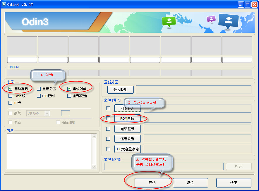 5、点“Start”按钮。Odin将开始刷写,完成后手机会自动重启。