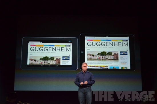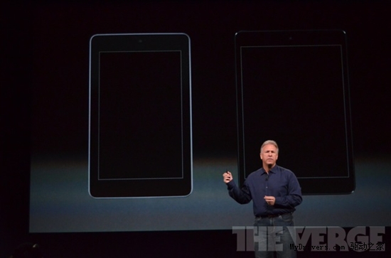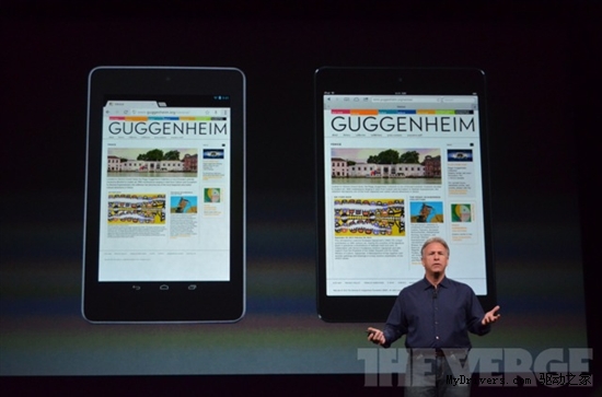 1:51 iPad mini对比Nexus 7,前者外壳铝制金属,而后者是塑料。