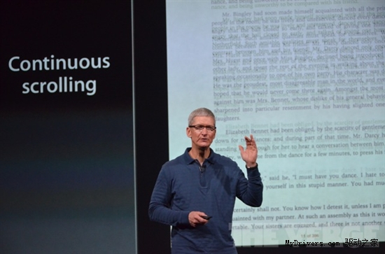 1:11 苹果发布新版iBooks,支持无限滚屏,翻页之外的新模式。支持内文分享功能,支持更多语言,包括中文日文竖排。