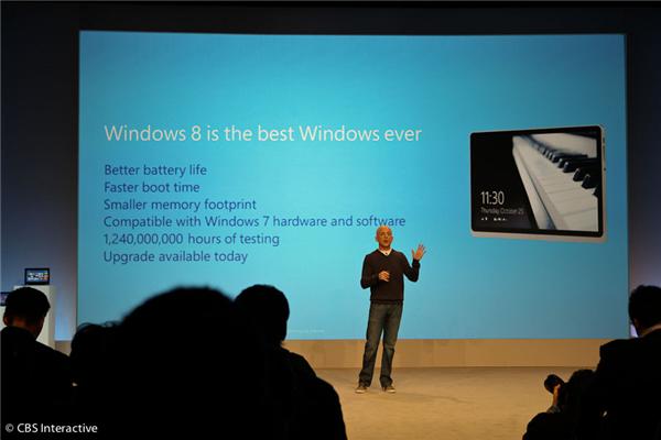 他介绍了Windows 8的一些优势:更长的电池时间,更快的启动时间,更高效的内存管理,还有强大的伙伴以及针对硬件设备的兼容性。对消费者而言,升级费用仅为39.99美元。