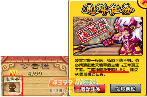 霄宝殿一役后,杨戬下落不明。势必问清截教天镜幕后主使与玉帝真正下落。追缉杨戬任务正式开启,建议60级后接此任务,且每天只能接任务一次。
