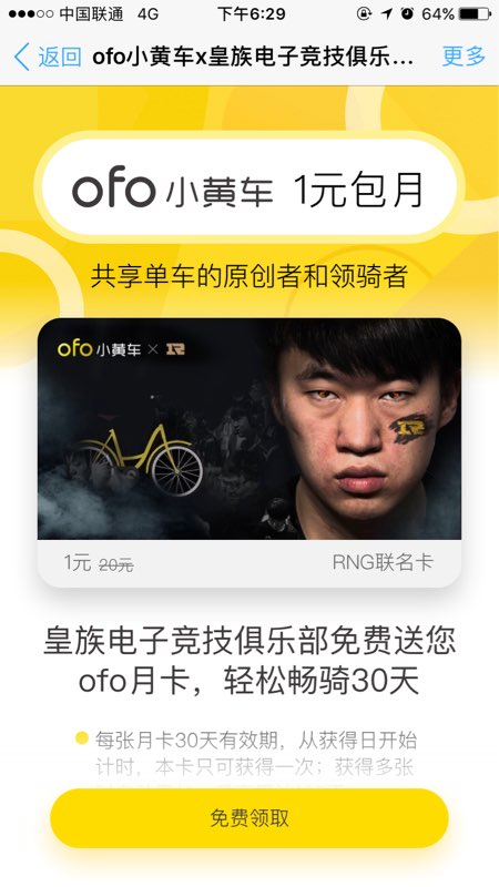 RNG小黄车ofo月卡领取地址:https://common.ofo.so/newdist/?MouthCardPage&channel=34055_1504063259982&type=2&duringType=1&subType=61323941