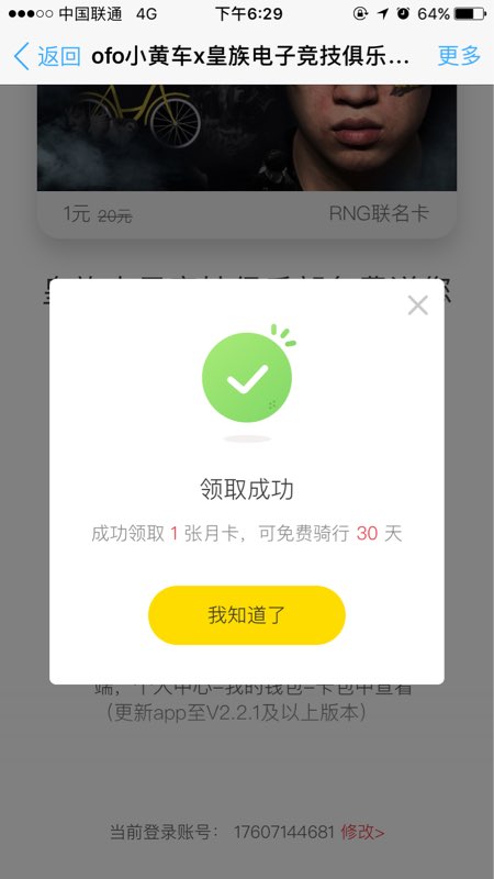 RNG小黄车月卡领取后在你的ofo app个人中心查看