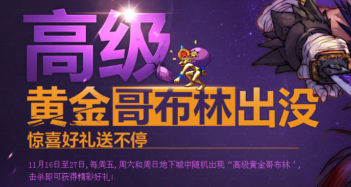 11月16日至27日,每周五,周六和周日地下城中随机出现“高级黄金哥布林”,击杀即可获得精彩好礼!