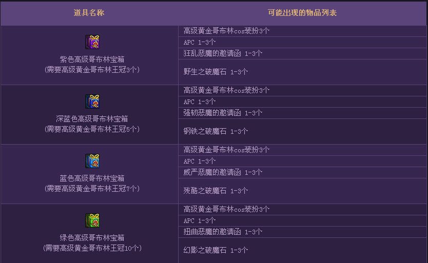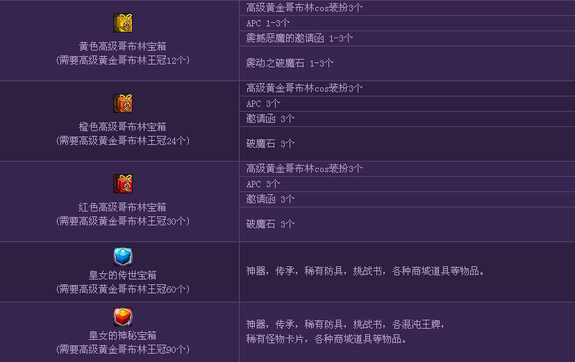 活动期间,每周五,周六和周日,地下城中随机出现“高级黄金哥布林”,击杀黄金哥布林后可以获得“高级黄金哥布林王冠”道具。