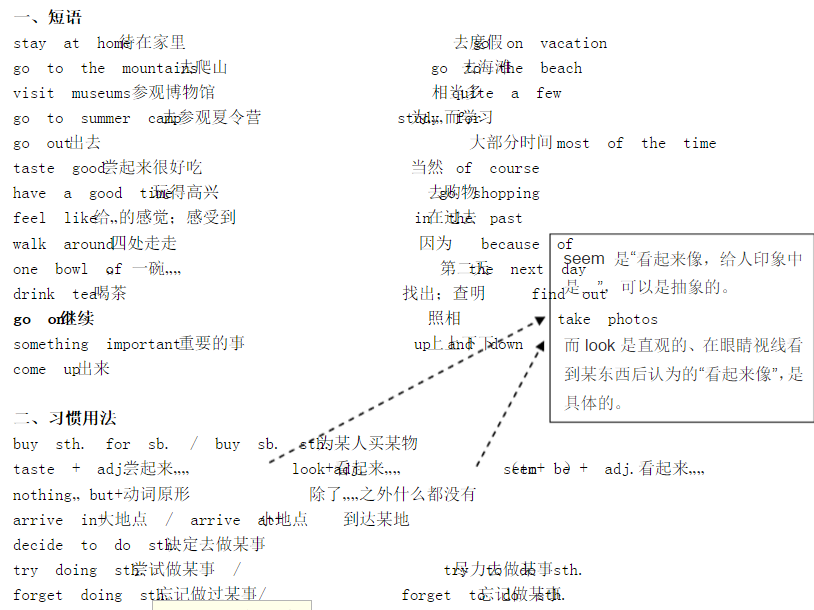 go to the beach去海滩 visit museums 参观博物馆 go to summer camp去参观夏令营 quite a few相当多 study for为……而学习 go out出去 most of the time大部分时间 taste good尝起来很好吃 have a good time玩得高兴 of course当然 in the past在过去 feel like给……的感觉;感受 go shopping去购物 walk around四处走走 because of因为 one bowl of… 一碗…… the next day第二天 drink tea喝茶 find out找出;查明 go on继续 take photos照相 something important重要的事 up and down上上下下 come up出来 buy sth. for sb. / buy sb. sth.为某人买某物 taste + adj. 尝起来…… look+adj. 看起来…… nothing…but+动词原形 除了……之外什么都没有 seem+(to be)+ adj. 看起来…… arrive in+大地点 / arrive at+小地点 到达某地 decide to do sth.决定去做某事 try doing sth.尝试做某事 / try to do sth.尽力去做某事