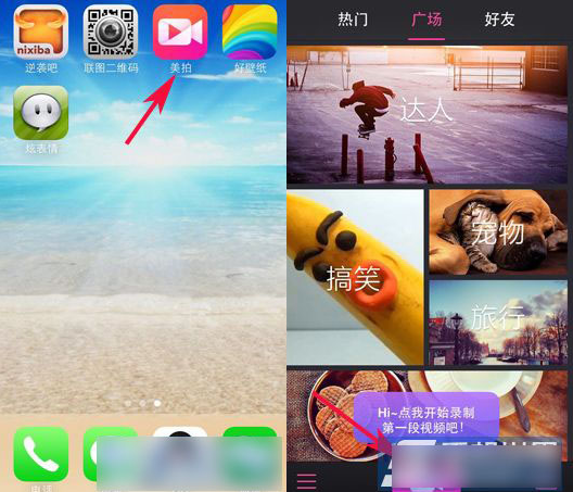 1)首先点击【美拍】打开(点击下载美图美拍),准备好了吗?点击下方【录制】按钮。(如下图所示)
