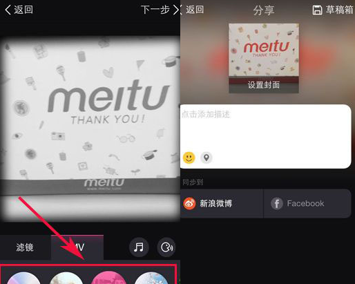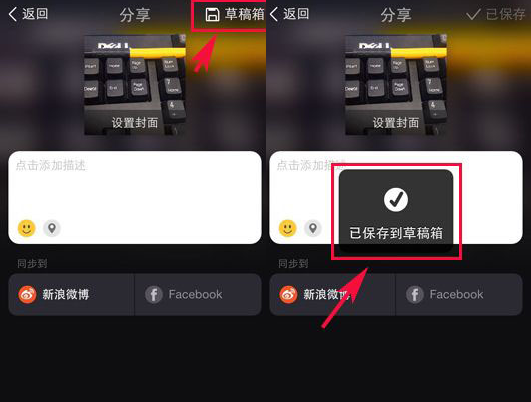 4)在美拍最后的分享界面里,大家不要点击分享就不会上传分享出去了,想要保存可以直接点击右上角的【草稿箱】,点击后会弹出提示【已保存到草稿箱】即可。(如下图所示)