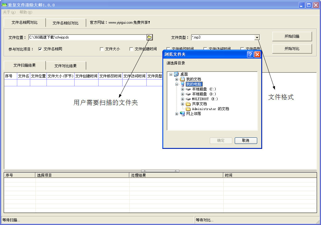 用户首先要选定扫描哪个文件夹中的重复文件,并且需要指定扫描文件的格式