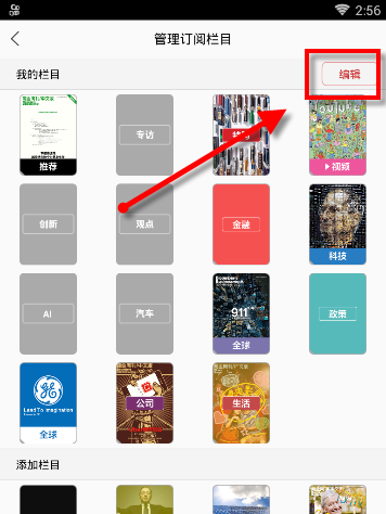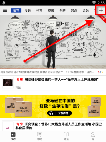 1.打开商业周刊APP,需要管理栏目的用户点击右上角的+号按钮