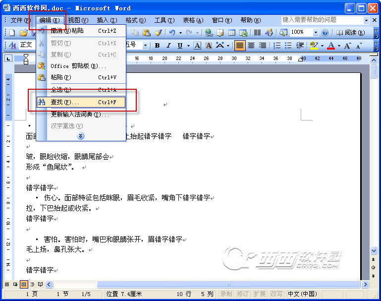 要批量清除这些错字怎么办呢?很简单,选择菜单中的“编辑”栏目里的“查找”