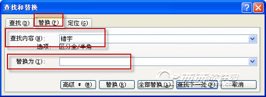 在弹出来的“查找和替换”对话框里选择“替换”,在查找内容里输入要修改的文字“错字”,然后下面一栏的“替换为”什么也不填写。点击“全部替换”。