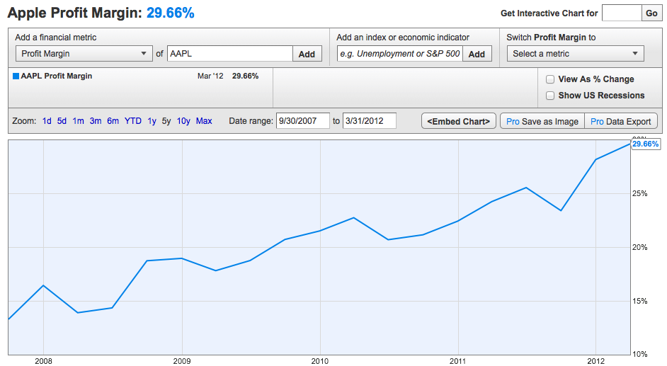 图六:受其利润率的影响,其短期股价也在持续攀升中。(但是iPhone5发布之后的一段时期已经开始跌落)