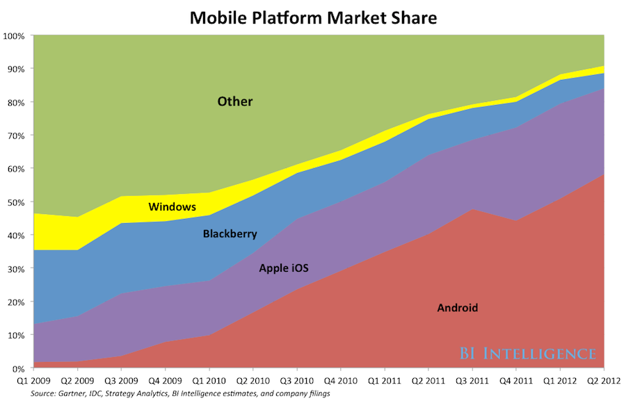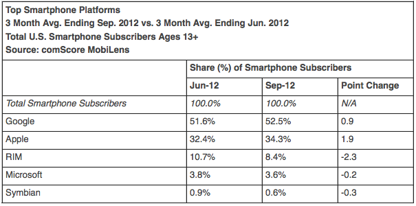 在2012年第三季度,IDC的报告显示,Android的销量占据了75%的智能手机市场,同期,苹果只占据有15%的销量。Android的增长和苹果的萎缩体现出零和游戏的趋势。在美国,苹果的市场占有率仍然很是可观。ComScore的报告声称,在9月Android占据了53的市场占有率,相比之下苹果也有34%,超过1/3的市场占有体现出苹果的业务仍然健康,但是发展趋势缺不那么乐观: