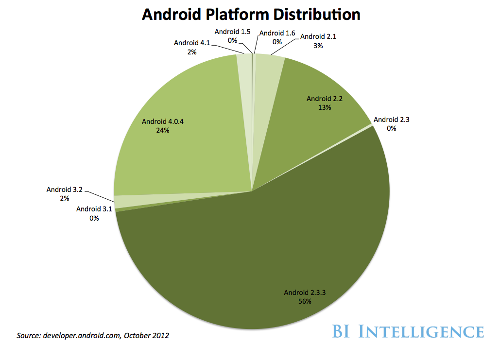针对Android的第二个批评是它太过分散了,存在许多版本的系统,并且开放授权让开发组织或是运营商热衷于推出定制版本。这使得Google无法将搭载了Android系统的手机更新到最新版本。这的确是一个软肋,尤其是当它需要面对高度统一化的苹果平台的竞争时。