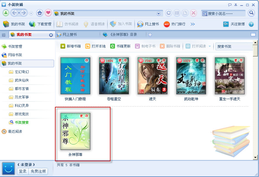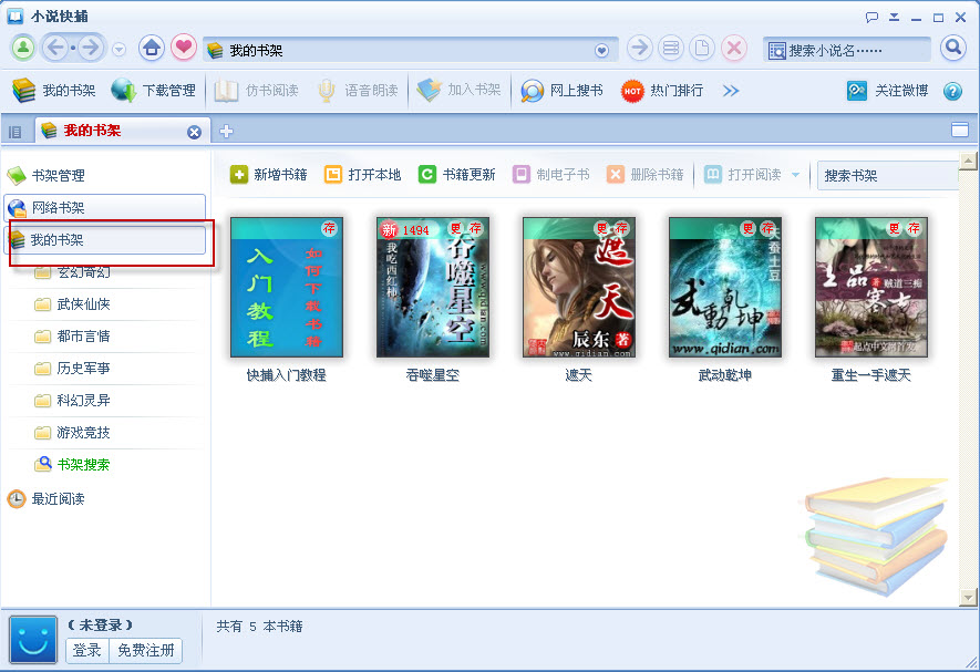 1.打开小说快捕,它默认的显示页面是:我的书架