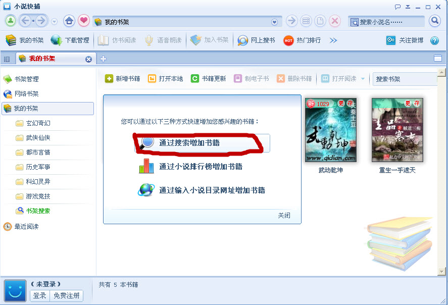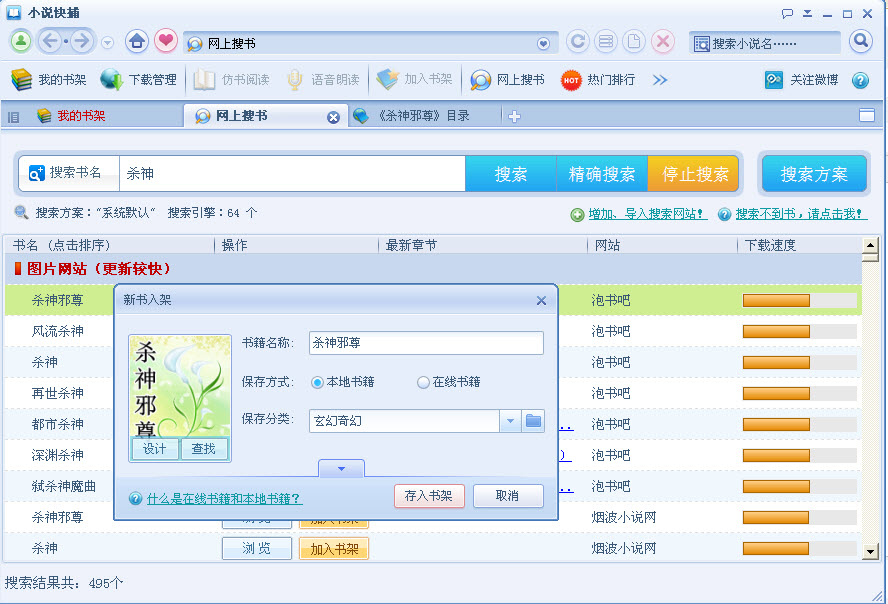 2.加入书架有两个选项:本地书籍和在线书籍。选择本地书籍他就会帮你下载并保存显示在书架,选择在线书籍则是在书架保存小说名、标志。