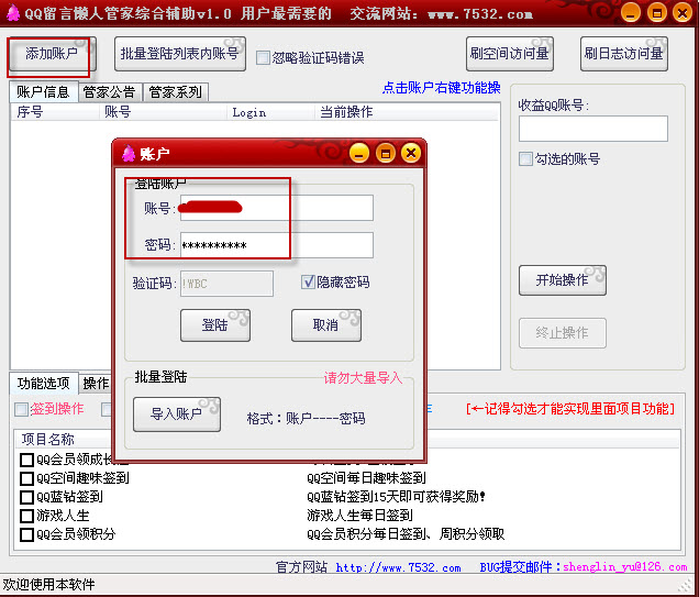 1.运行“亿家QQ留言懒人管家”登陆自己的qq号
