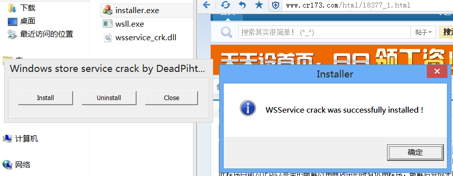 3、安64位的请运行wscrack_64中的install.exe,32位系统请运行wscrack_32中的install.exe,在弹出的对话框中选install,安装服务,成攻提示如图