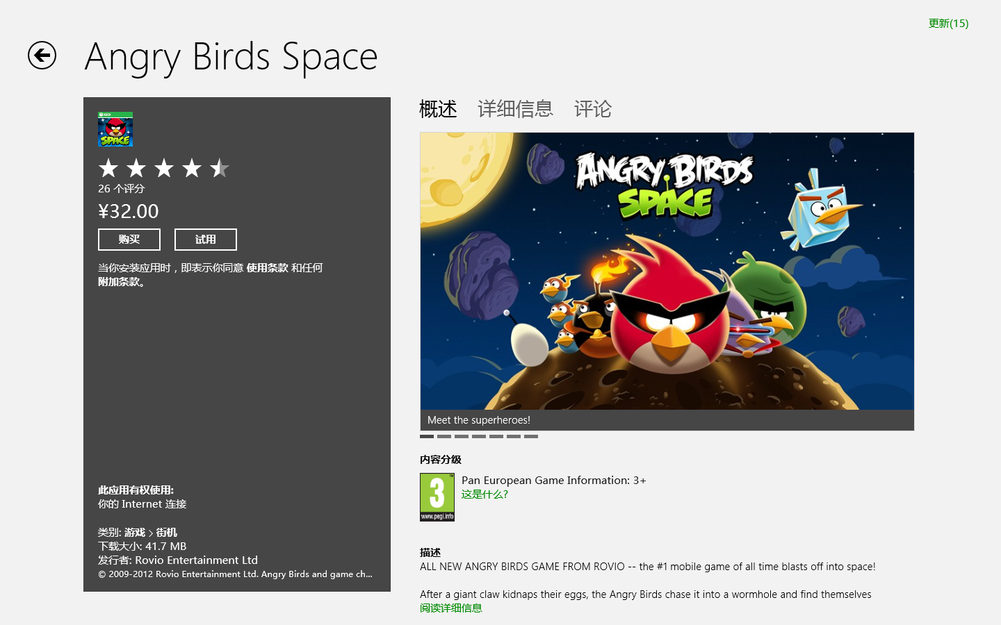 1、在商店中找到 Angry Birds Space 应用,点击试用进行安装
