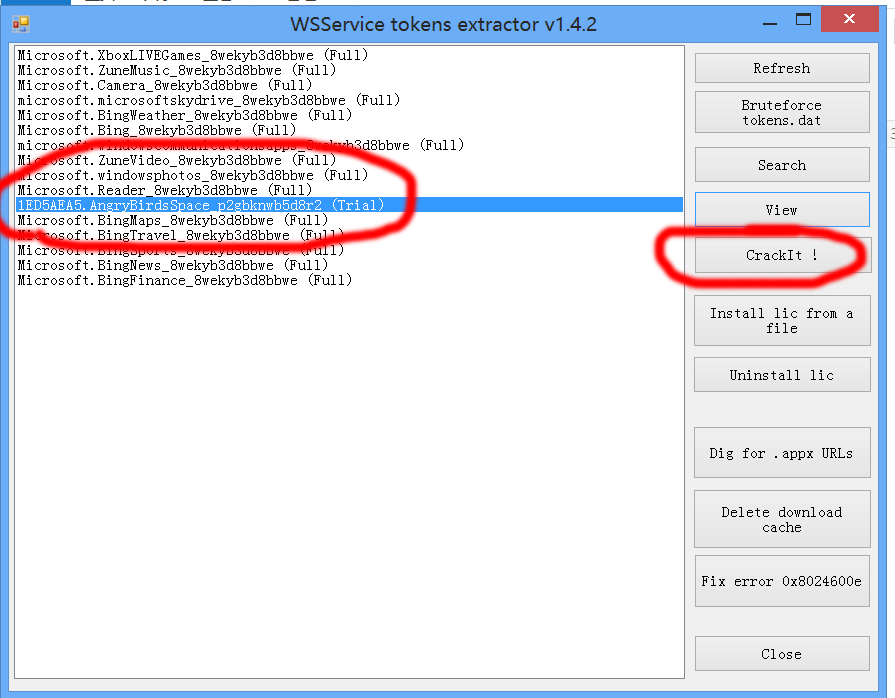 3、打开TokensExtractor,找到Angry Birds 这个应用,看图还是Trial,选中点击crack it! 就可以了