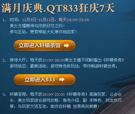 20级以上玩家每天的12:00-24:00在游戏主城内(轩辕城)“QT传音使者”NPC接取“QT传音使者送祝福”任务。接取任务后,玩家再进入《轩辕传奇》官方房间QT833 在线满一个小时即可到“QT传音使者”NPC处交任务,成功交任务后可获得一个礼 包;